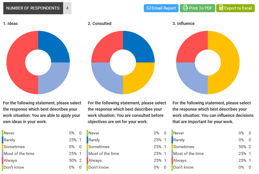 Good health and wellbeing can be a core enabler of employee engagement and organisational performance, so measuring and understanding these dynamics is fundamentally important to a healthy company. VirtlX Reflect offers a report that easily portrays the outcomes of the surveys, orientated around seeking out these dynamics and presenting the results in a manner that is easy to interpret.